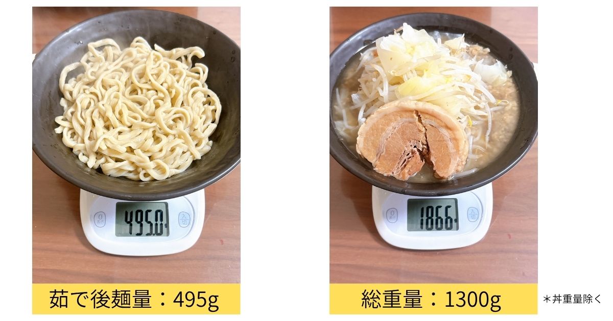 茹で後の麺量495gは一般的なラーメンが約200gと考えると約2〜2.5杯分に相当です。