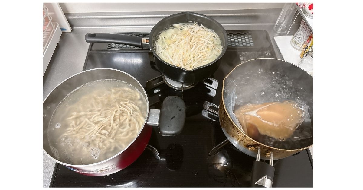 - 野菜用、スープ用、麺用のお湯を沸かす(約10分)