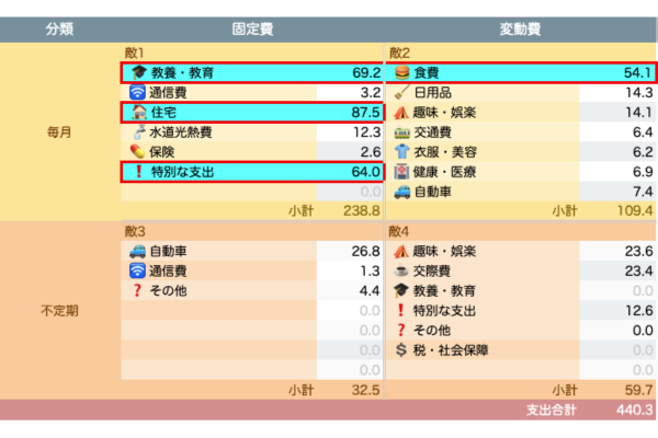 上位TOP4はお馴染みの「住宅費」、「教育費」、「特別費」「食費」となっております。