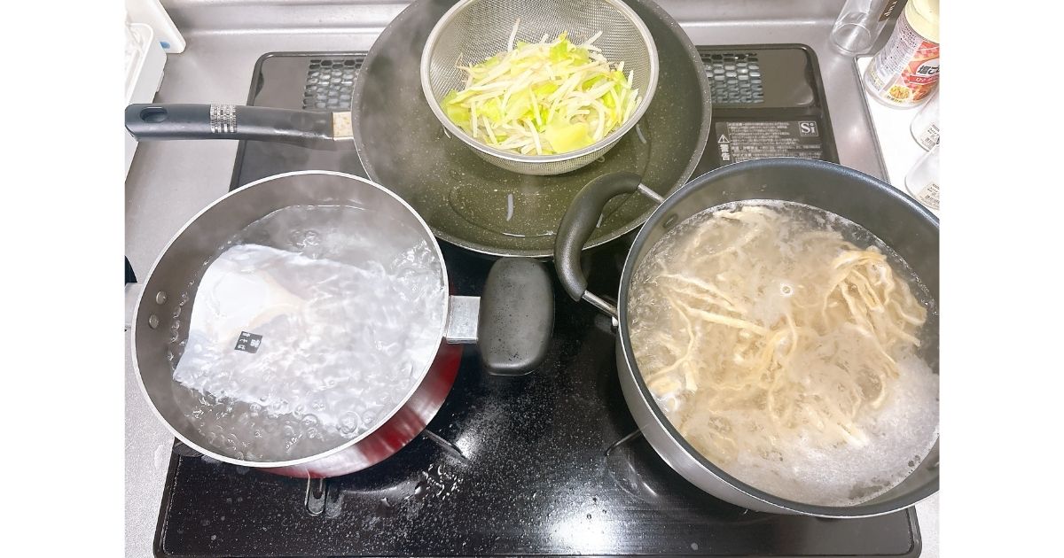 ▶︎一番時間かかりますので先に入れましょう - 野菜(もやし、キャベツ)を茹でる