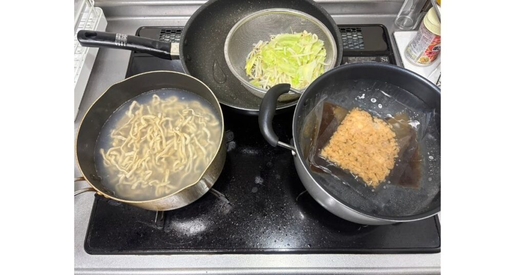 ▶︎一番時間かかりますので先に入れましょう - 野菜(キャベツ、もやし)を茹でる(茹で加減はお好みで)