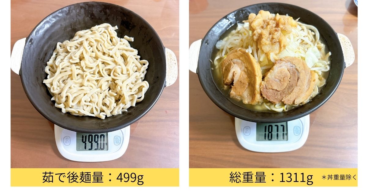 茹で後の麺量499gは一般的なラーメンが約200gと考えると約2〜2.5杯分に相当です。