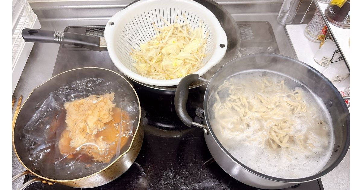- 野菜用、スープ用、麺用のお湯を沸かす(約10分)
