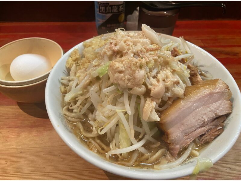 「ラーメン二郎」は東京都三田に本店を構えるラーメン店で、極太麺と濃厚な豚骨醤油スープ、そして山盛りの野菜やニンニクが特徴です。学生や社会人を中心に熱狂的なファンが多く、“ジロリアン”と呼ばれる愛好家も存在します。(出典:Wikipedia「ラーメン二郎」)