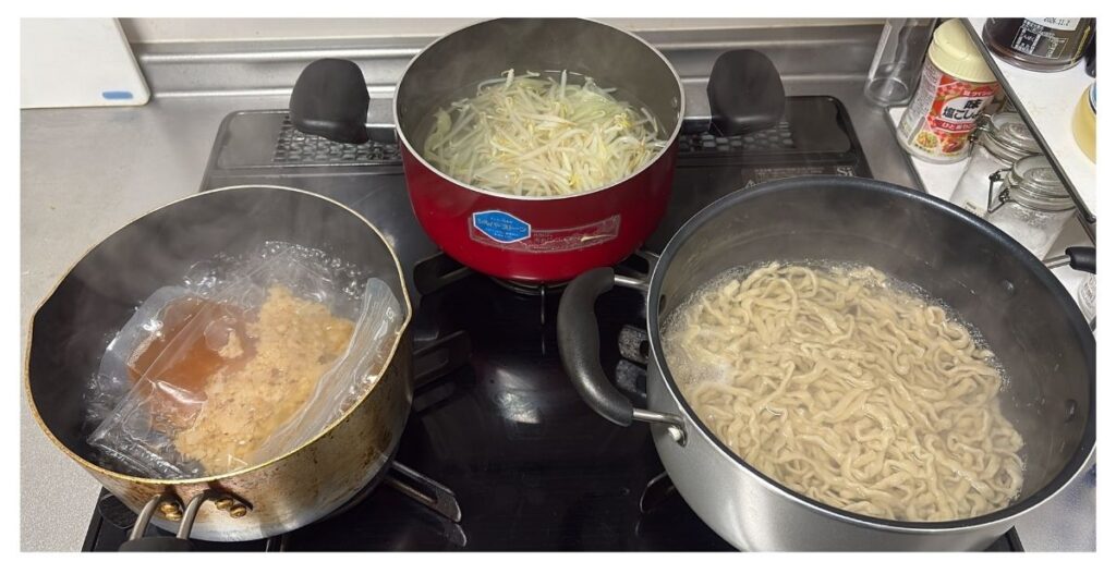 - 野菜用、スープ用、麺用のお湯を沸かす(約10分)
