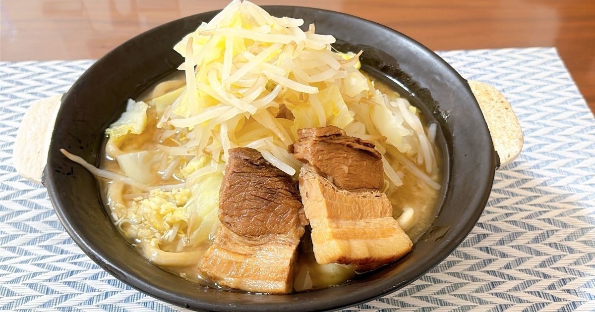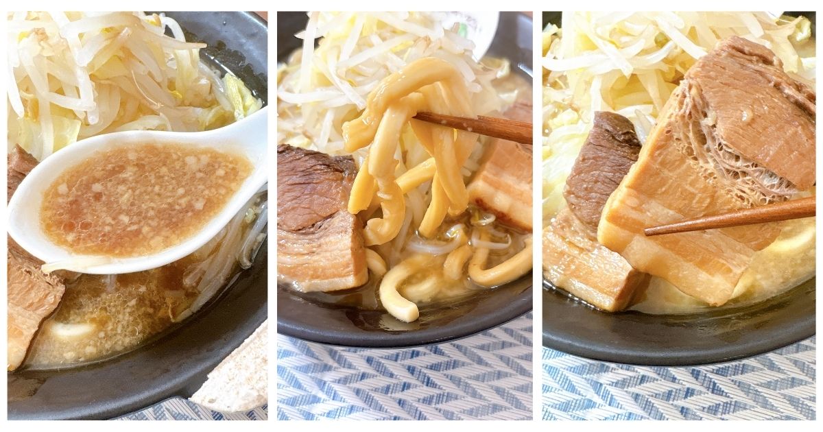 超極太麺と存在感抜群の豚は、ボリューム満点ながら最後まで飽きずに食べ進められます。
