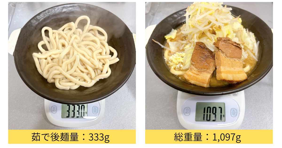 麺量は茹で後で333gと他の二郎系と比較すると若干少なめで、二人で食べるには若干少なめ。