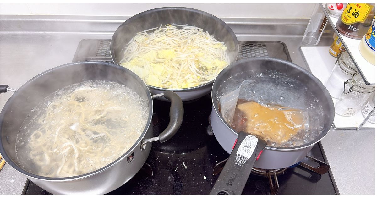 - 野菜用、スープ用、麺用のお湯を沸かす(約10分)