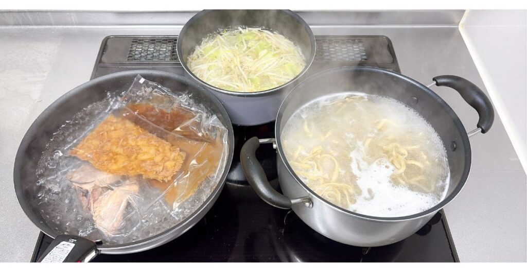 - 野菜用、スープ用、麺用のお湯を沸かす(約10分)