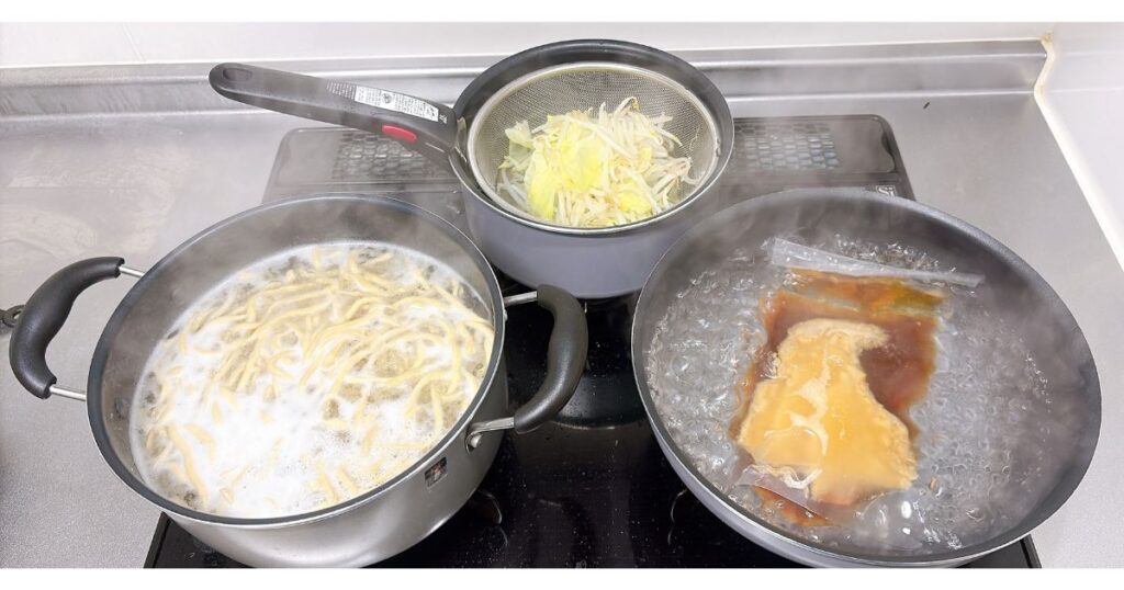 - 野菜用、スープ用、麺用のお湯を沸かす(約10分)