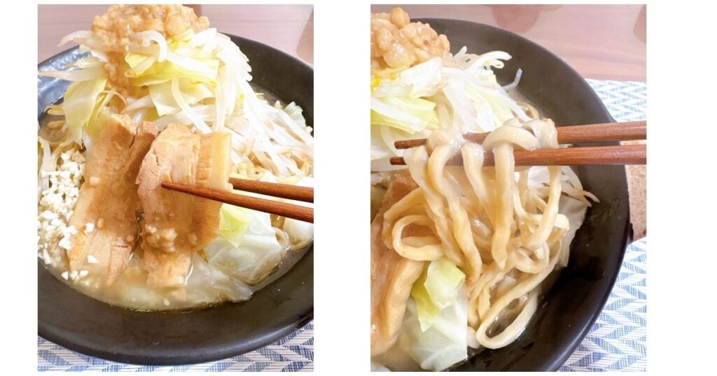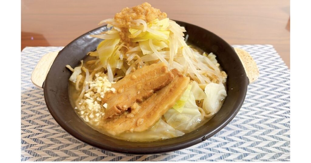 味がしっかり染み込んだチャーシューや、野菜・ニンニクとの相性も抜群で、満足度の高い一杯に仕上がっています。