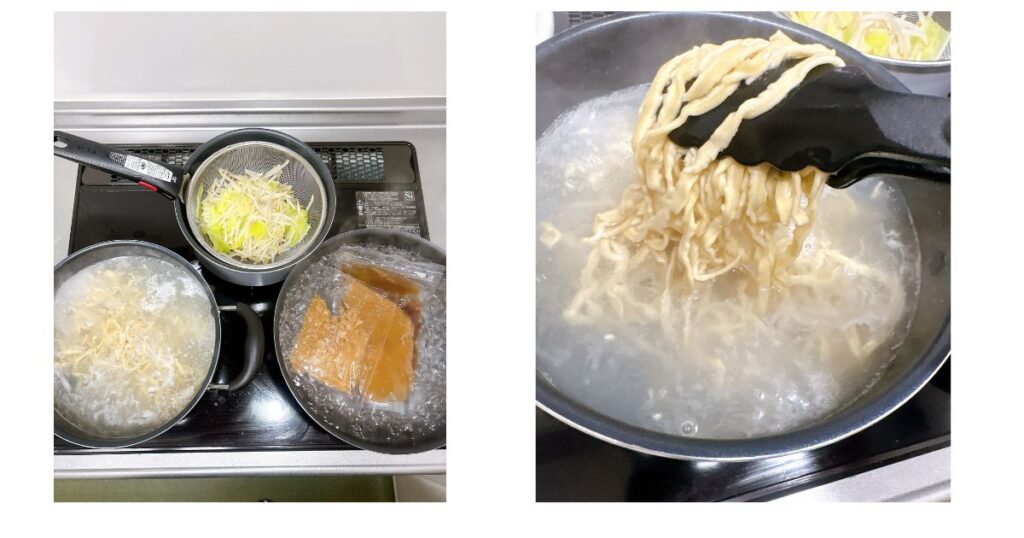 - 野菜用、スープ用、麺用のお湯を沸かす(約10分)