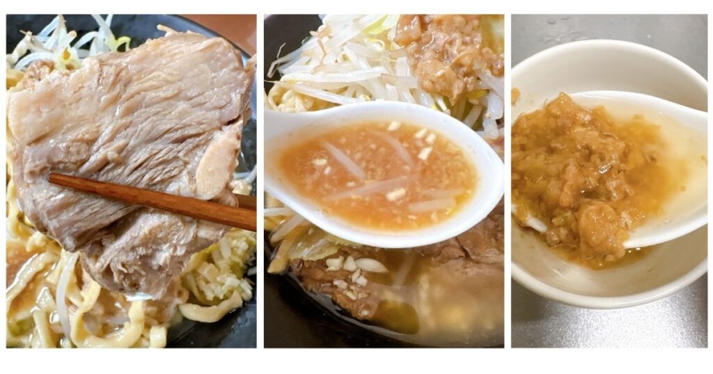 プルプル味付き脂もついていて、野菜といっしょに食べても良し、麺をくぐらせて油そばとして食べても良し!